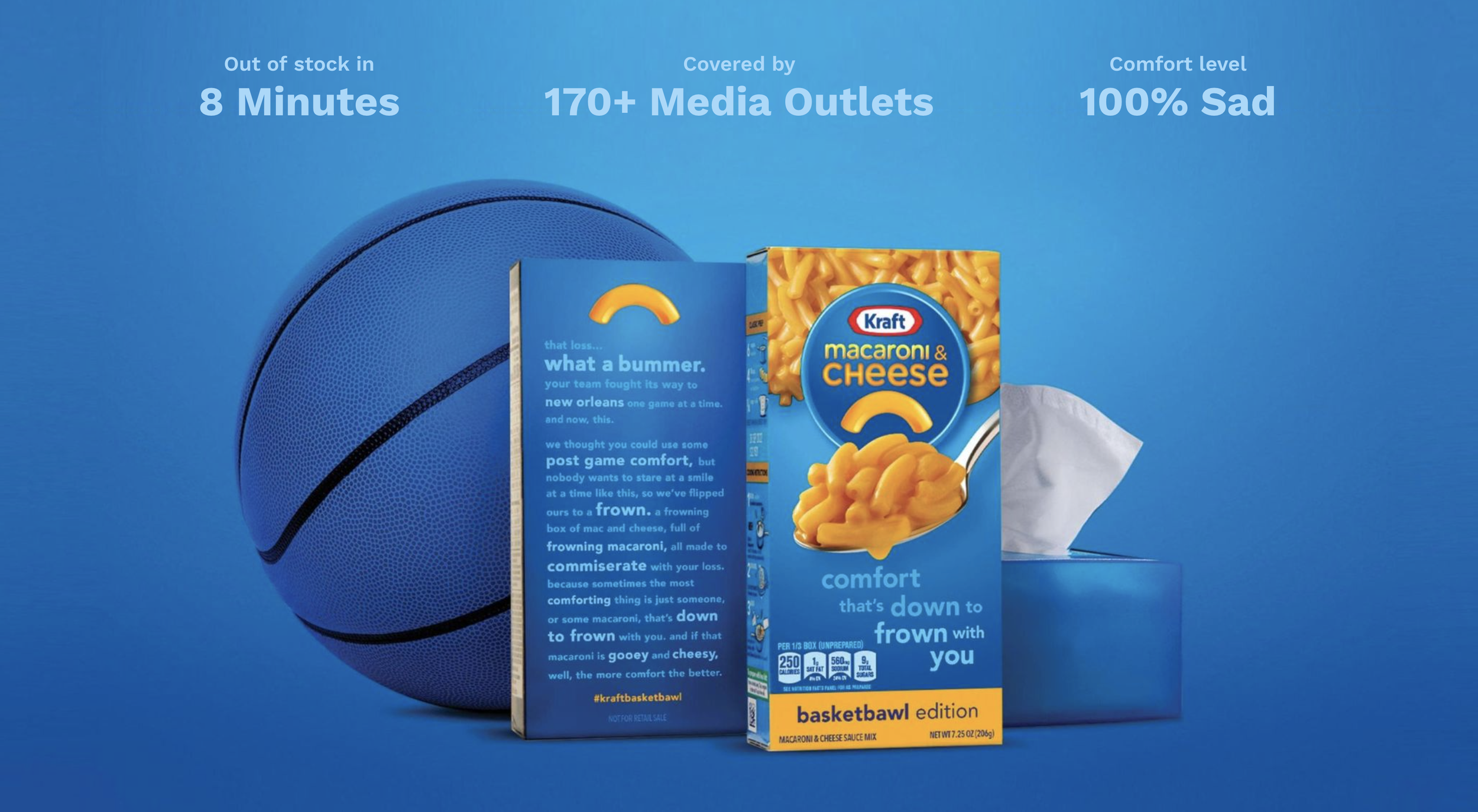 To commiserate with losing March Madness fans we created a special box of Kraft Mac & Cheese full of frowning noodles, as we flipped Kraft’s iconic noodle-smile upside down.